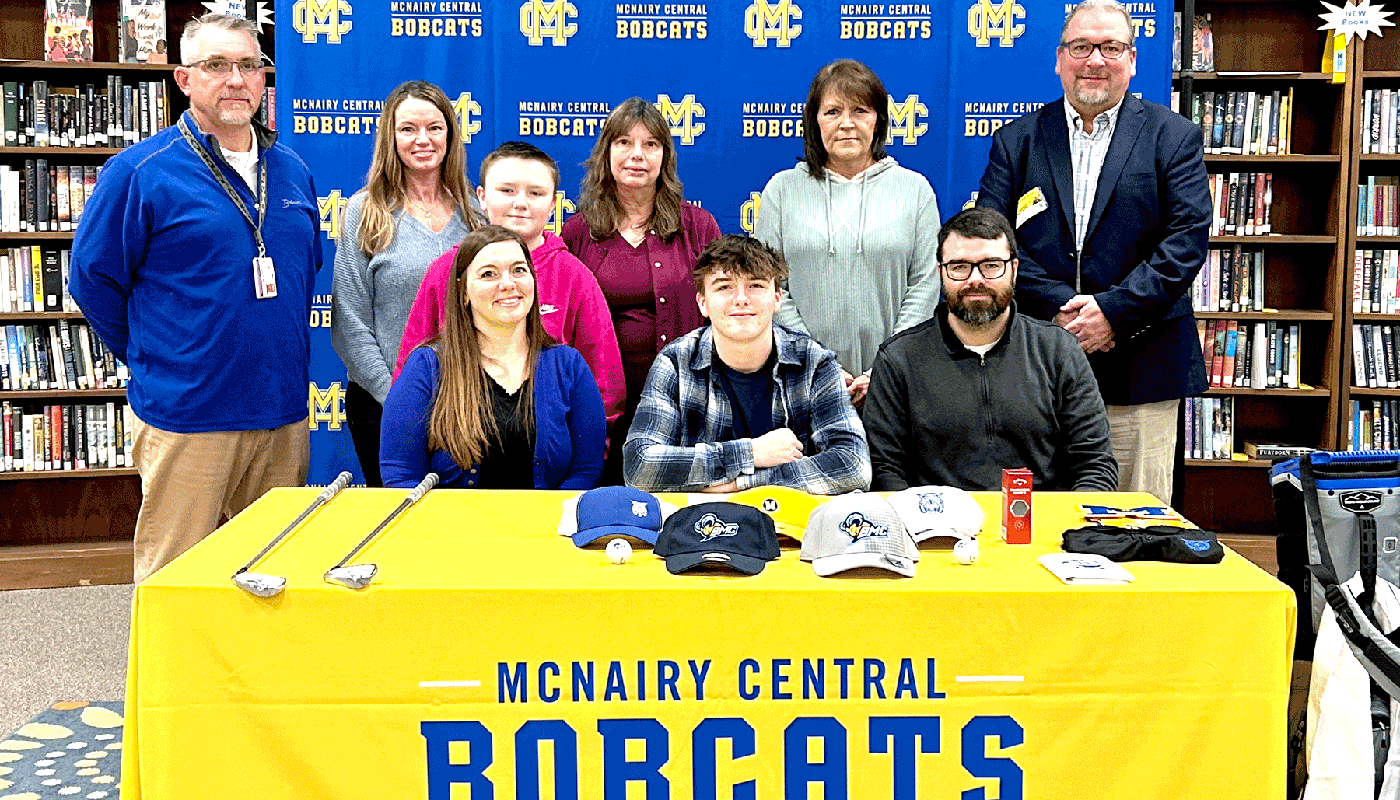 Lambert is pictured with his parents, Chris and Tonya Lambert, brother Riley, Memaw Glenda Judd, Nana Shirley Lambert and Aunt Shari McDonald. Also pictured are MCHS Golf Coach Jim Merry and Blue Mountain Head Coach Kevin Barefield.