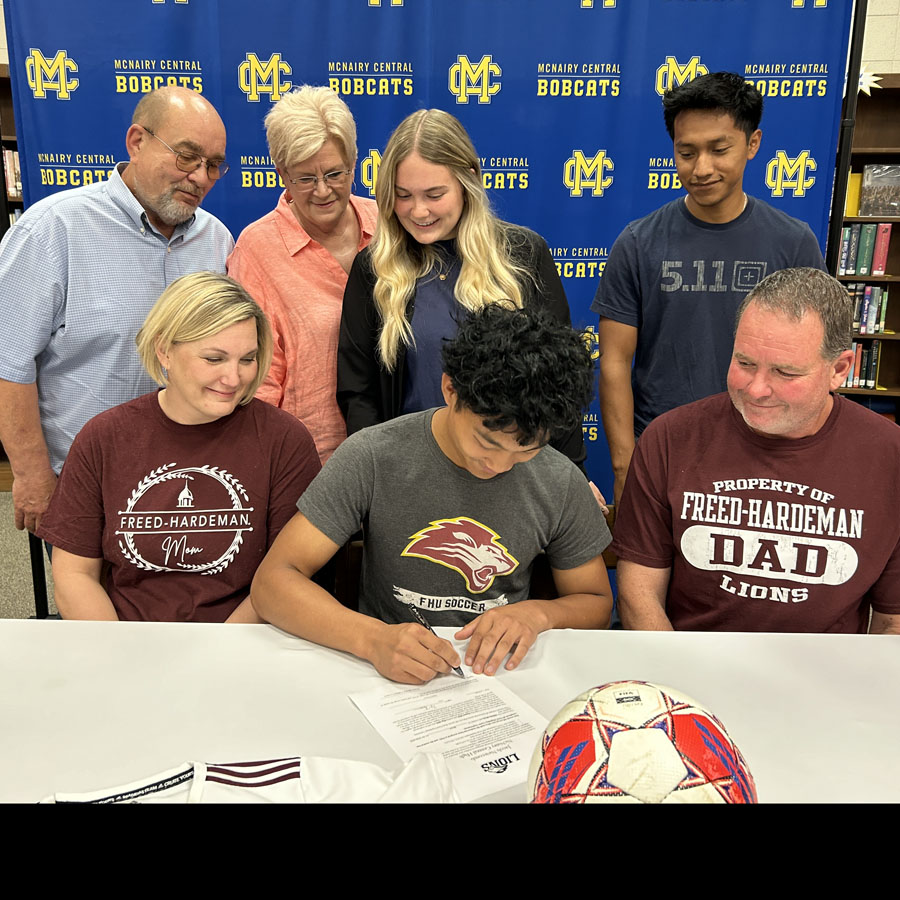 Bobcat senior Jacob Newcomb has signed a letter of intent to play soccer for Freed Hardeman University next year. Newcomb is pictured with his parents, Kevin and Amy Newcomb, siblings Jeremiah and Maddie Newcomb, and Papaw and Nana (Donald and Freda Turner).