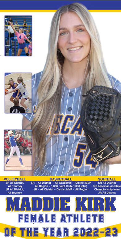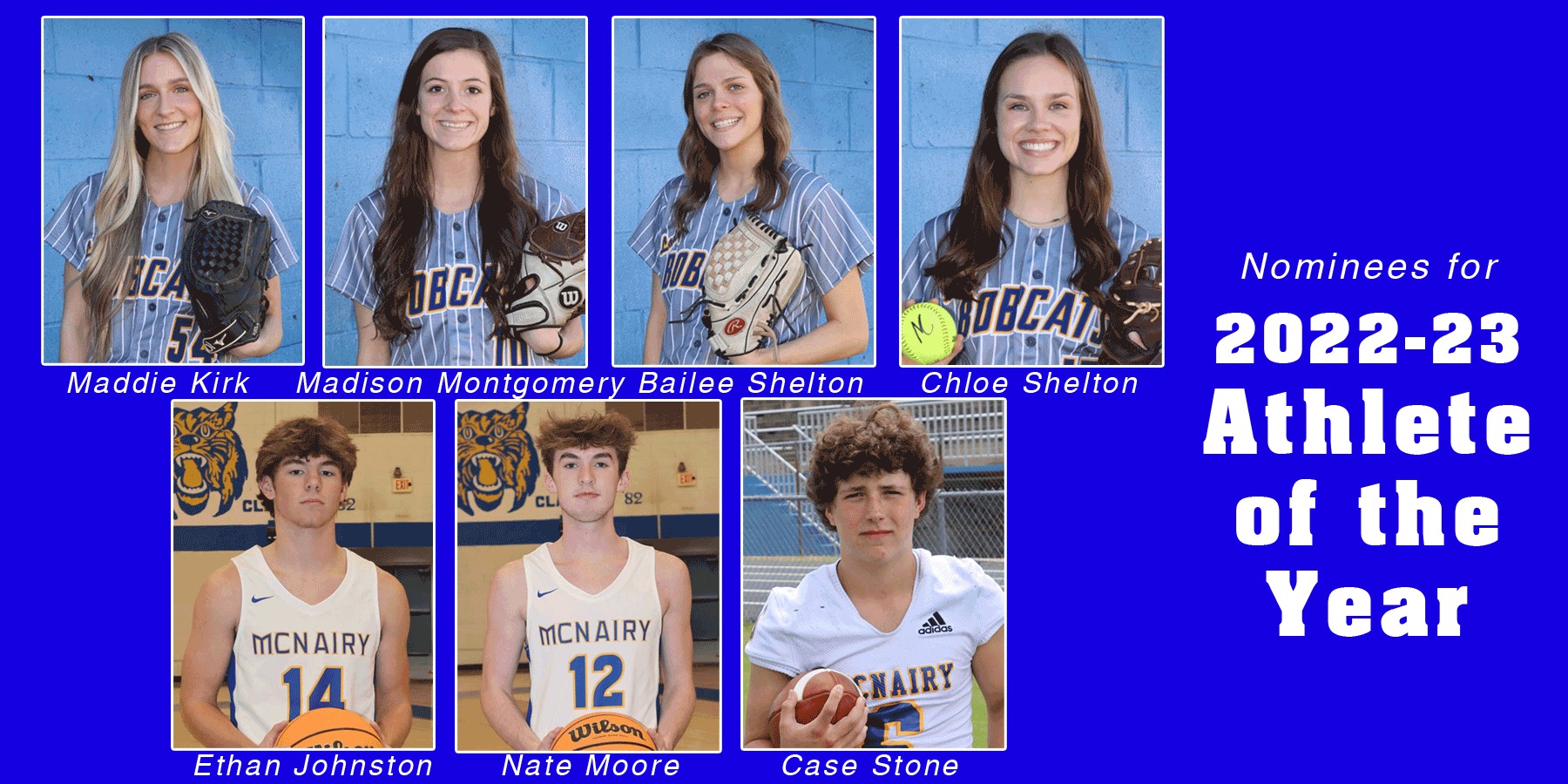 The MCHS Sports Hall of Fame Committee has nominated seven students from the 2022-23 school year for their athletic accomplishments. These seven students will be recognized at the banquet, with one male and one female being named as Athlete of the Year. Nominated are Maddie Kirk, Madison Montgomery, Bailee Shelton, Chloe Shelton, Ethan Johnston, Nate Moore and Case Stone.