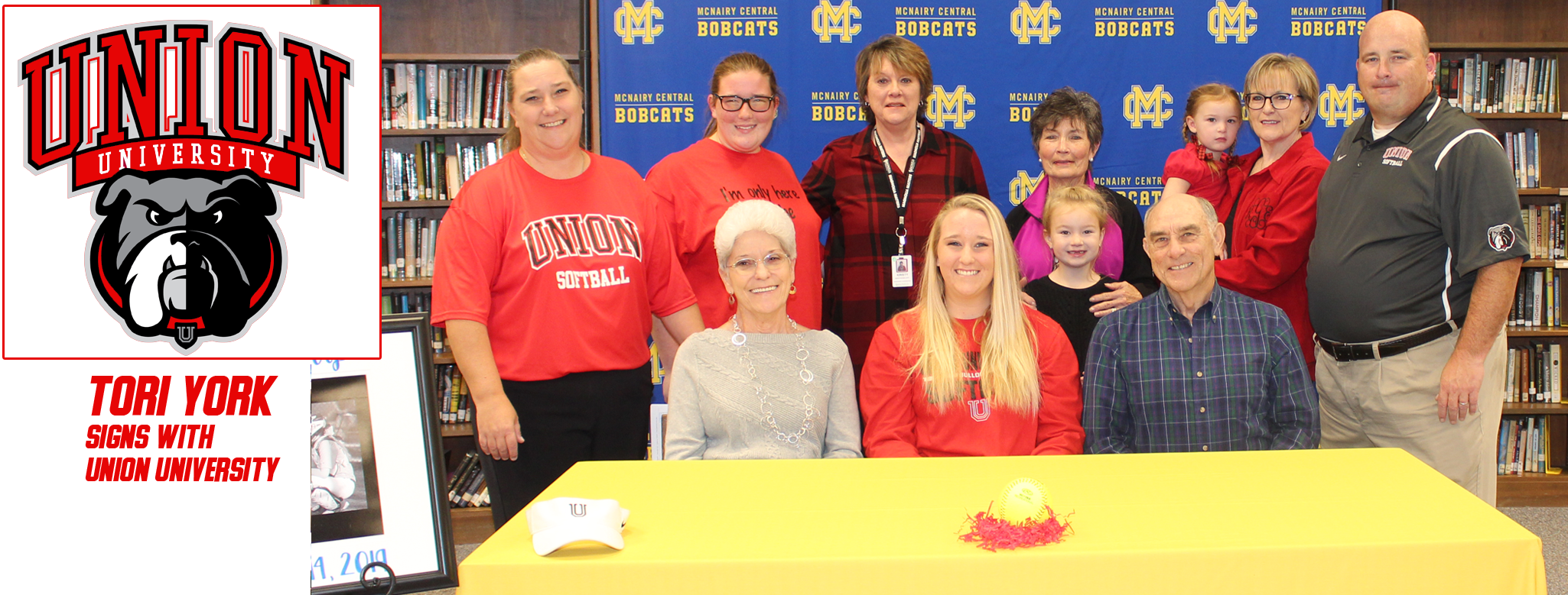 Tori York, 4-year softball letterman, has signed to play college ball at Union University. York plans to major in physical therapy and become an athletic trainer, with the goal of earning her doctorate in physical therapy. She is pictured with her parents, Mark and Robin York, sister Kyndle York, and family members. York's favorite softball memory is double-dipping to beat Chester County in the district championship her freshman year.