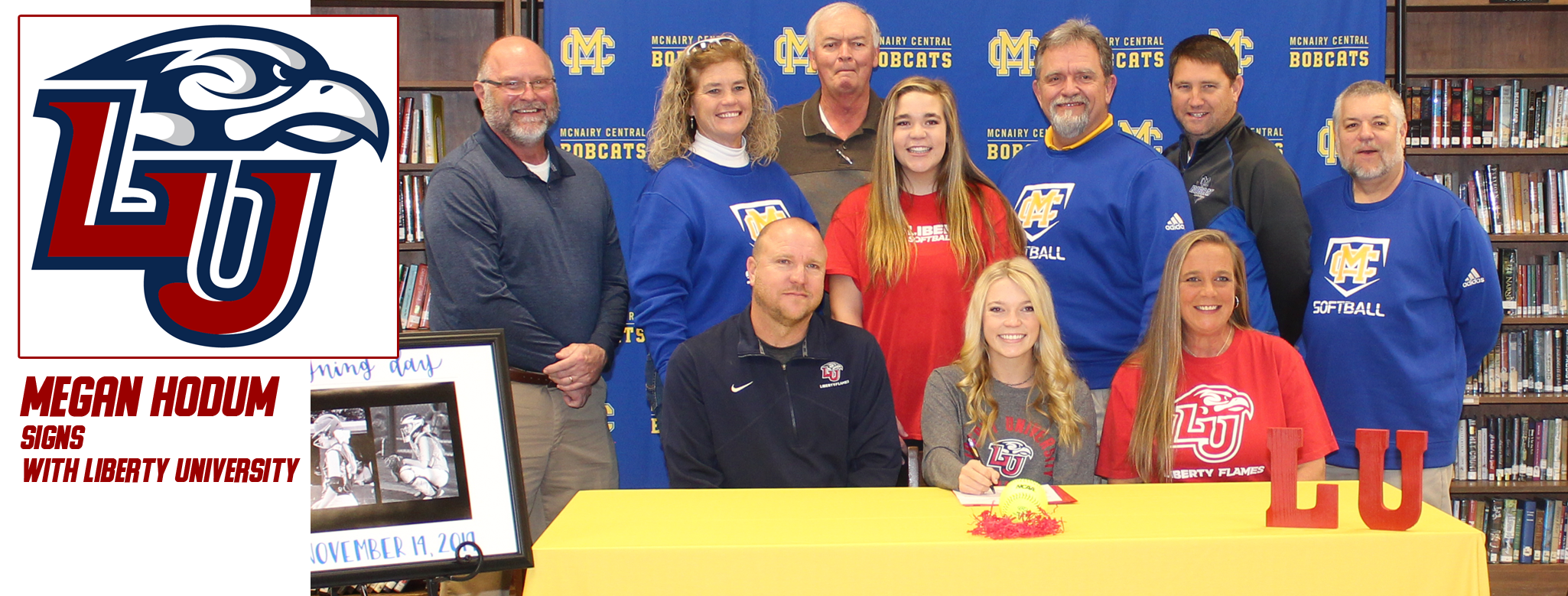 MCHS senior Megan Hodum has signed to play softball on the college level at Liberty University. Hodum plans to major in nursing. Her favorite softball memory is winning the World Series at 10 years old. The title was especially memorable to Hodum as it was a double-dip win, having to beat the other team twice in the championship. Hodum pitched the final few innings after a long day. Hodum is pictured with her parents, Billy and Leigh Hodum, sister Neely Hodum, MCHS principal Dr. Jerry Pyron, Basketball Coach Jerry Lott, Athletic Director Brian Franks, Softball Coach Mellanie Surratt and assistants Jimmy Ray and Steve King.