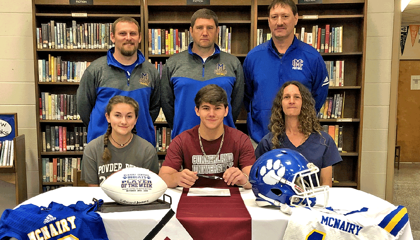 Anthony White will play football at Cumberland University this fall. Anthony plans to become a Mechanical Engineer. He said his favorite memory was the last second interception against South Gibson to seal the win and make the playoffs. Pictured with Anthony are his sister Emily White and mother Lindsay Guida. Also pictured are MCHS Coaches Brian Franks, Lamar Aldridge, and Kyle McDaniel.